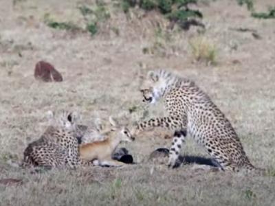 肯尼亚马赛马拉国家保护区小猎豹不知道如何吃小羚羊 又蹭又舔!(蜘蛛网eeook.com报...
