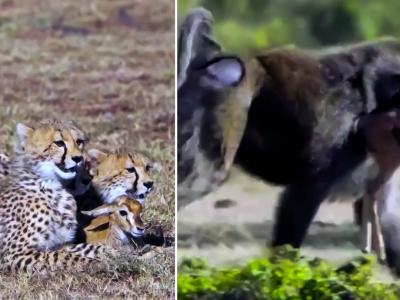 肯尼亚马赛马拉国家保护区小猎豹捕获小瞪羚却不懂如何吃掉 路过狒狒顺手牵羊(蜘蛛...