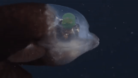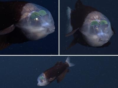 美国海洋生物学家在蒙特雷湾2000呎海底拍摄到貌似异形头部呈半透明的深海桶眼鱼(蜘...