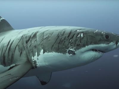 澳洲南部外海的海王星群岛海中一只大白鲨不知何故身上伤痕累累(蜘蛛网eeook.com报...