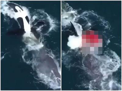 美国加州海岸9公尺长灰鲸遭5头虎鲸攻击