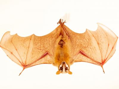 在印尼的雅加达,一只圈养的花面狐蝠(masked flying fox)头下脚上地倒挂着。 PHO...