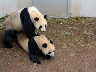 日本东京上野动物园的大熊猫真真和力力4年来首次交配工作人员用长棍戳真真,观察它...