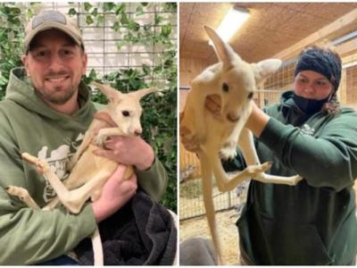 美国纽约州哈珀斯维尔动物园喜迎患有罕见遗传病“白变症”的红大袋鼠婴儿幼崽(左)...