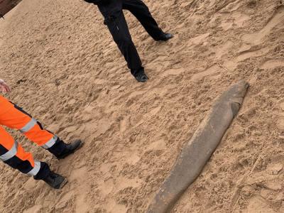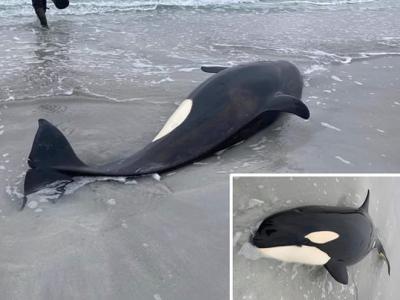 英国苏格兰奥克尼群岛海滩一条身长3.4米的年轻杀人鲸在岸边搁浅(蜘蛛网eeook.com报...