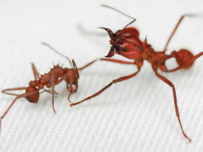 没有盔甲的巨首芭切叶蚁(左)和有盔甲的巨首芭切叶蚁(右)。(蜘蛛网eeook.com报...