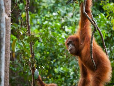 在印尼古农列尤择国家公园(Gunung Leuser National Park)里,一只雌性苏门答腊猩...