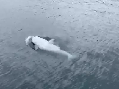 患有白血病的罕见白色虎鲸Tluk靠近美国圣