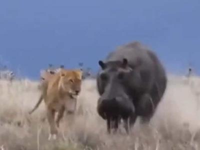 肯尼亚马赛马拉国家保护区一只瘦小狮子想猎食正在午睡的巨型河马 结果悲剧了(蜘蛛...