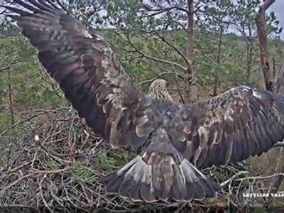 拉脱维亚金雕享用大餐却重心不稳翅膀扫到巢里的幼鸟(蜘蛛网e...