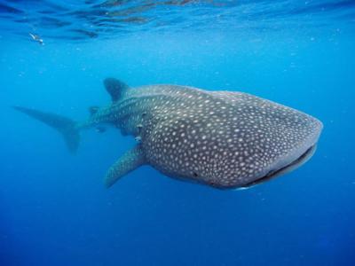 一只鲸鲨在犹加敦半岛(Yucatán Peninsula)外海泅泳。 这些...