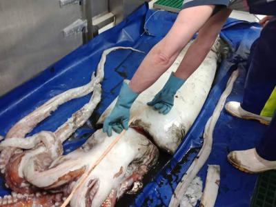 新西兰国家水资源与大气研究所工作人员在研究长尾鳕时偶然抓住一只巨型鱿鱼(©...