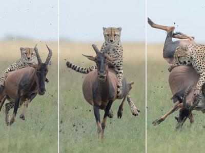 游车河?肯尼亚马赛马拉野生动物保护区猎豹捕猎骑在羚羊的背上(蜘蛛网eeook.com报...