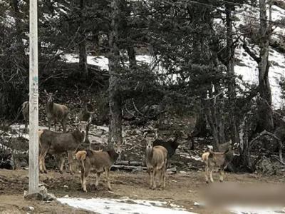 四川省甘孜州白玉县麻绒乡马门村村民拍摄到一群白唇鹿在雪地上休憩喝水(蜘蛛网eeo...