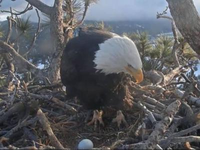 母“Jackie”紧张照看白头海雕蛋。白头海雕父母喜迎今年首枚白头海雕蛋。(蜘蛛网e...