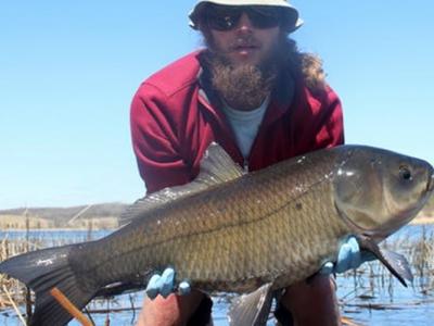 这条小鲤牛胭脂鱼(Ictiobus cyprinellus)摄于达科他州的加文斯角国家鱼类孵化场暨...