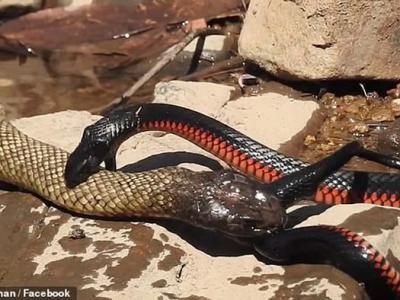 澳洲女子在昆士兰州波兰甸塞文河附近散步发现红腹伊澳蛇和蓝腹...