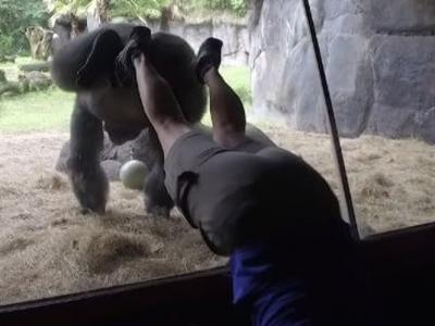 美国佛罗里达州主题公园西部低地大猩猩与训练员齐倒立 惊人默...