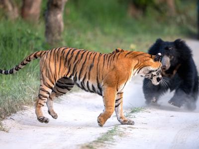 在印度北部的Pilibhit老虎保护区,游客目睹了一只熊和一只老虎的激烈交锋。(图片来...