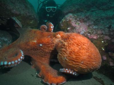 栖息在北海道知床半岛罗臼海域的巨大章鱼,张开手臂长达约3米。( 2024年5月30日上午...