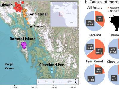 不同群体的雪崩死亡率。一张地图,描绘了2005-2022年阿拉斯加东南部四个研究地区无...