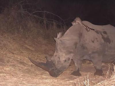 最近在南非拍到的新相机陷阱影片中,有一只麝猫坐在一只黑犀牛的背上。 (蜘蛛网...