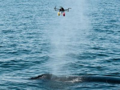 出动无人机飞到鲸鱼上方测量“口气”(PHOTO BY MICHAEL MOORE, WOODS HOLE OCEA...