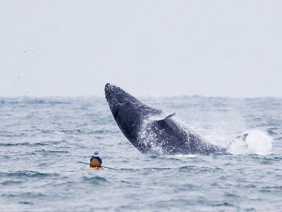 美国加利福尼亚洲沿海游客划皮艇突遇座头