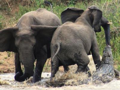 南非一只鳄鱼趁大象落单在河边喝水时咬住