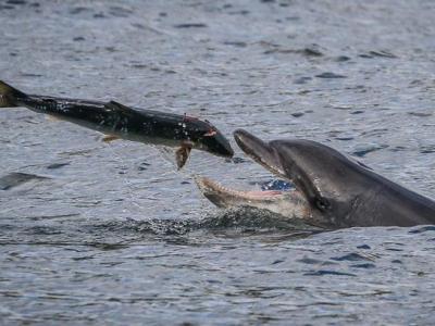 苏格兰东海岸宽吻海豚捕食大马哈鱼的精彩一幕 (蜘蛛网报道)据环球网(实...