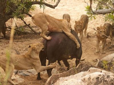 南非自然保护区老水牛孤身对战5头饥肠辘辘的雌狮 (蜘蛛网报道)...