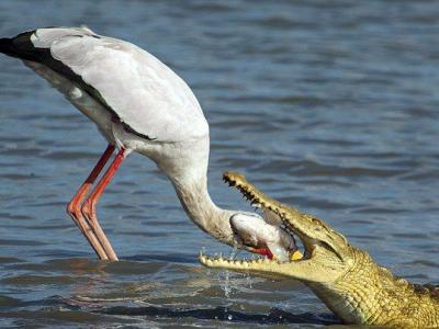 坦桑尼亚塞卢斯禁猎区鳄鱼强抢鹳嘴里的半个鱼头 (蜘蛛网报道)据环球网(...
