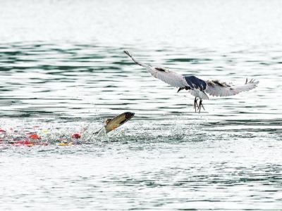 夜鹭被突然跳出的鲤鱼吓到 (蜘蛛网报道)据大河网:夜鹭本来就会抓鱼吃,...