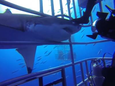 忙看眼前鲨鱼 回头大白鲨“露两排牙”