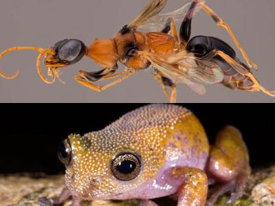 “催狂魔黄蜂”(上)可吸啜蟑螂,下图为变色青蛙。 新品种疣螈(上)及弯脚趾...