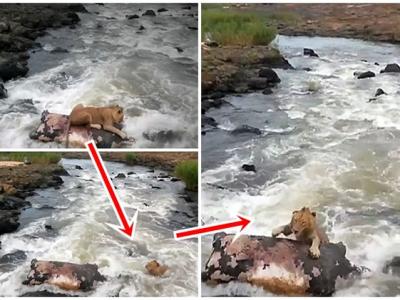狮子险遇溺惊险一幕被游客拍下 河马背太滑,令狮子滑下来。 狮子险被冲走 ...