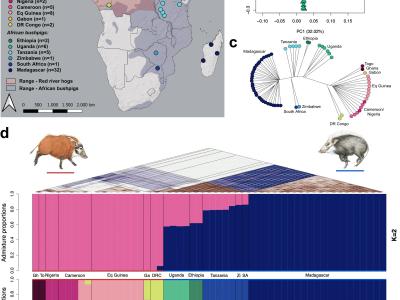 红河猪和丛林猪的取样和种群结构。本研究中使用的所有67头猪的取样图,按原产国着色...