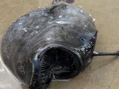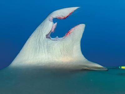 乔希·舍伦贝格于2022年7月31日在佛罗里达州朱庇特潜水时拍摄的雄性镰状真鲨的背鳍...