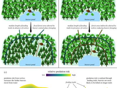 概念图描述了狼如何通过限制海狸觅食的距离来间接改变森林的轨迹。在没有狼的系统中...