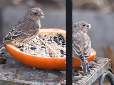 两个少年家雀一起吃在喂鸟器。左边的鸟有感染的迹象。鸣谢:艾维·芬内尔,饲料观察...
