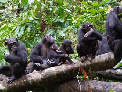 黑猩猩聚精会神地听着其他黑猩猩从一段距离以外的竞争对手群中听到的话。鸣谢:罗曼...
