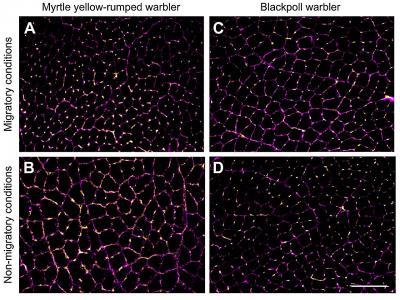 秋季迁徙和非迁徙条件下桃金娘黄腰莺和黑头莺胸肌的代表性图像。荧光免疫组织化学用...
