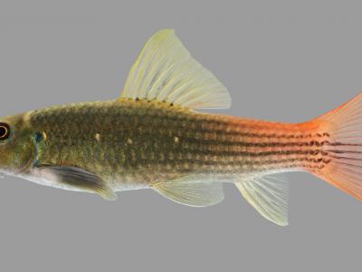 红尾加拉鱼的鱼鳞沿着尾巴突然转变为亮橙色和红色,这使它们很容易在清澈的溪流底部...