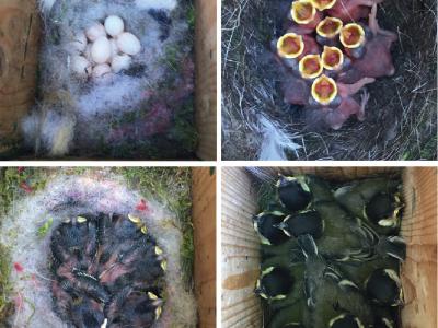 巢箱内的四个关键阶段:产卵(左上),卵孵化后两天(右上),孵化后一周(左下)和两周后...