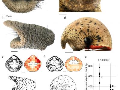 非洲象和亚洲象的鼻子尖须数量和密度不同。一只成年非洲象牛鼻尖的正面图(琳达,见...
