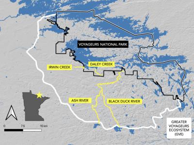 大旅行者生态系统地图(GVE;白线)。地图包括旅行者国家公园(黑线)和小溪/河流(黄线...