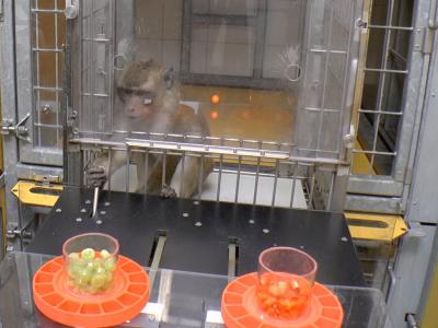 一只长尾猕猴(Macaca fascicularis)在一项实验中操作杠杆以获得奖励。在红色旋转木...