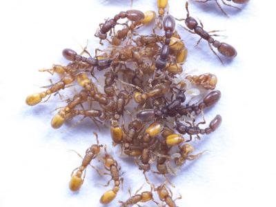 克隆突袭蚁的混合群体,包含类似蚁后的突变体,具有退化的翅膀或翼根。年长的工蚁是...