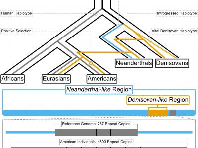 MUC19的进化历史。丹尼索瓦人样单倍型(橙色)首先从丹尼索瓦人渗入尼安德特人,然后...