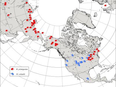 本研究中分析的标本的采样地点。符号代表本研究中包含的 M. primigenius(红色)和...